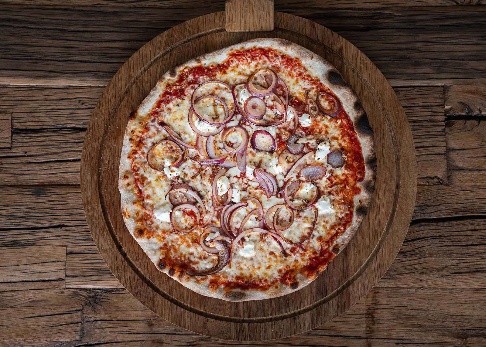 Tomatensaus, mozzarella, geitenkaas, rode ajuin