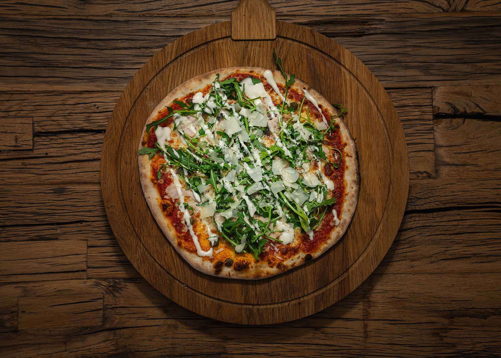 Tomatenaus, mozzarella, kip, kappers, ansjovis, rucola, parmesan