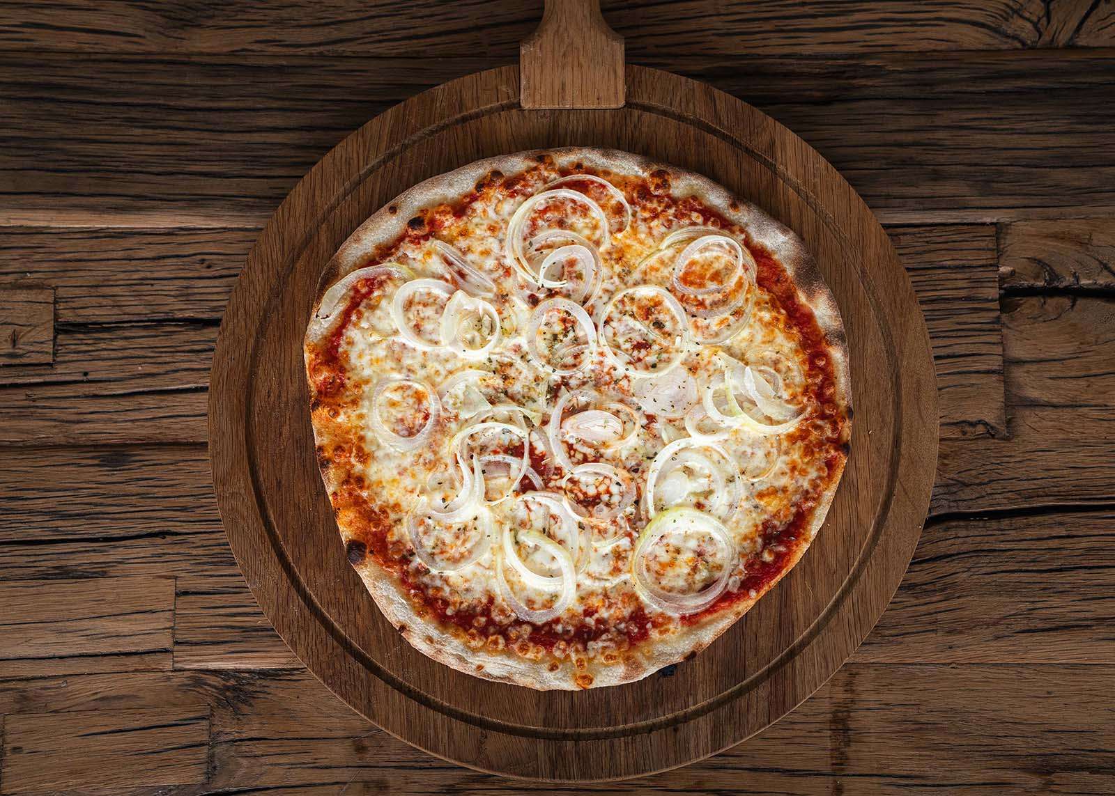 Tomatensaus, mozzarella, geitenkaas, rode ajuin