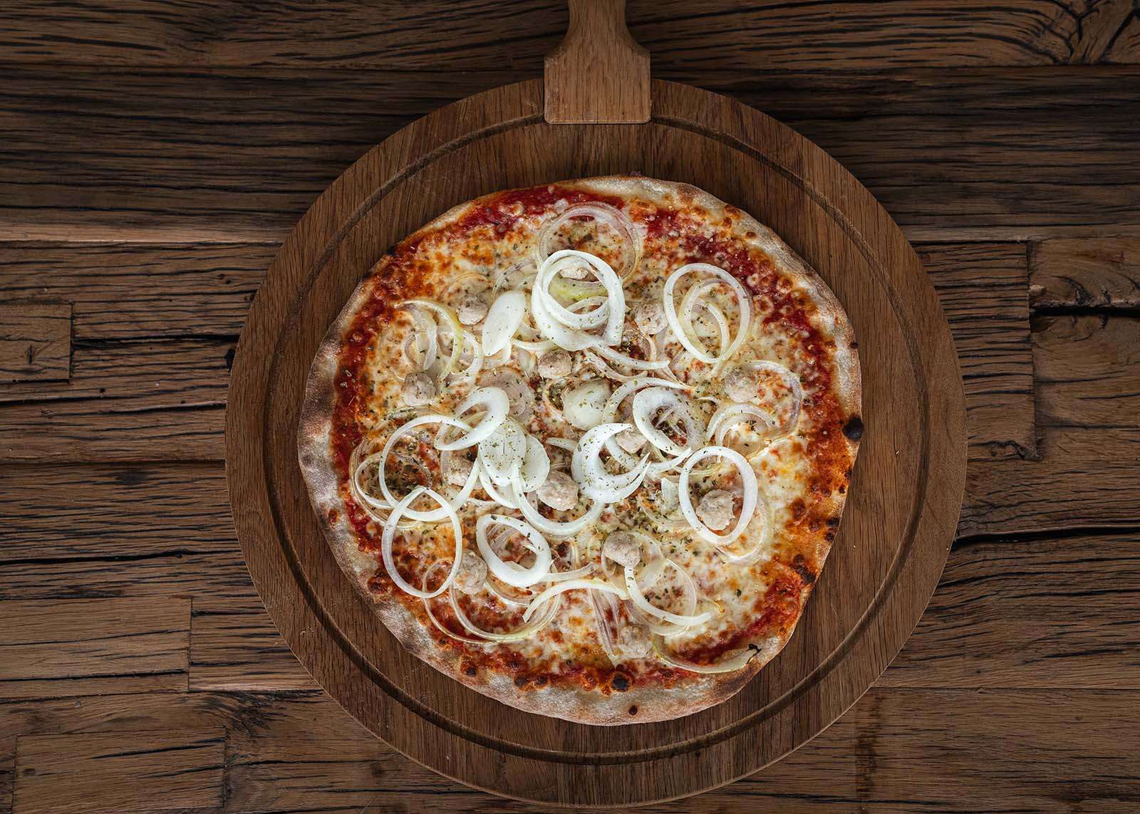 Mozzarella, tomatensaus, tonijn, ajuin