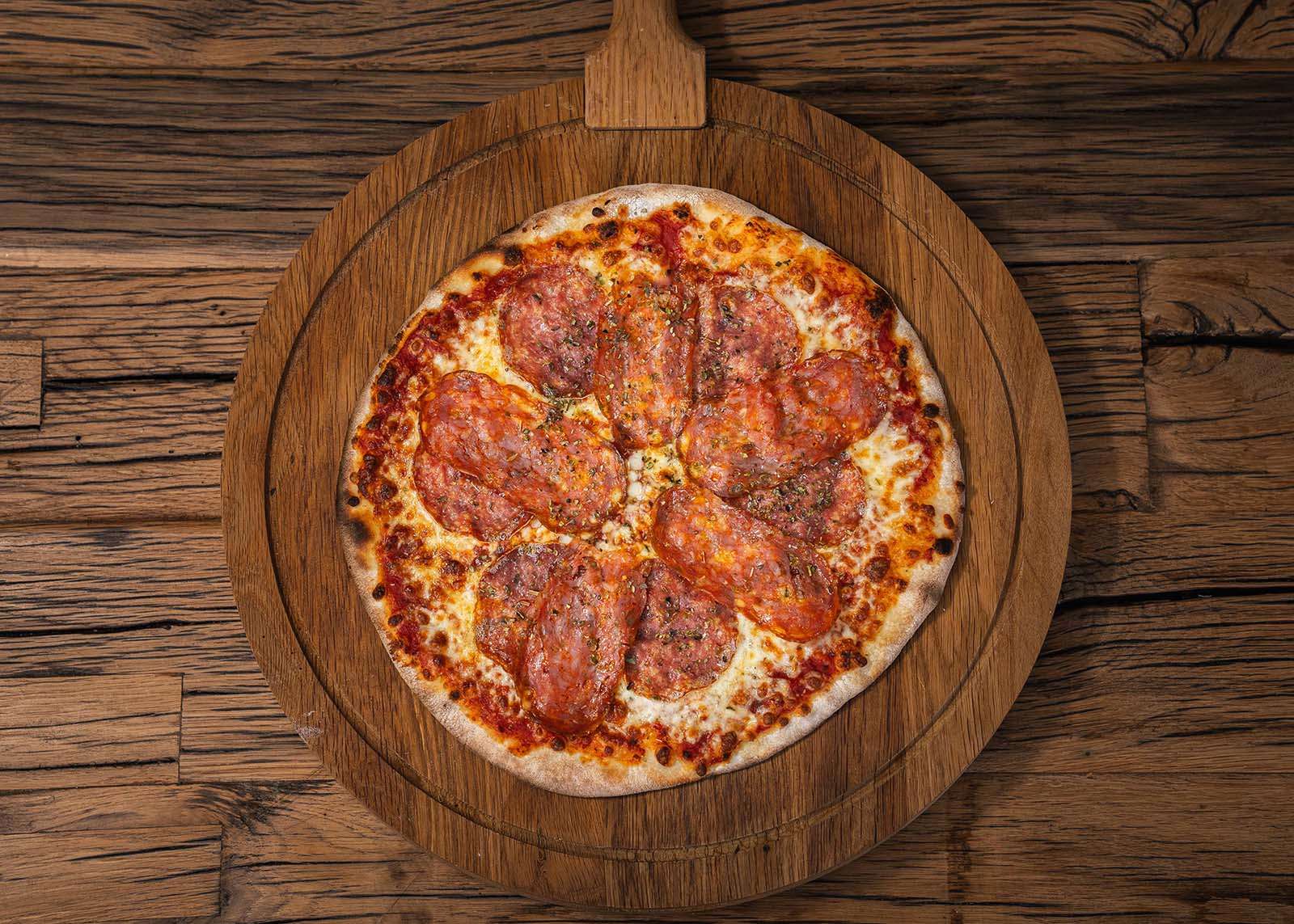 Tomatensaus, mozzarella, salami, pikante salami, oregano