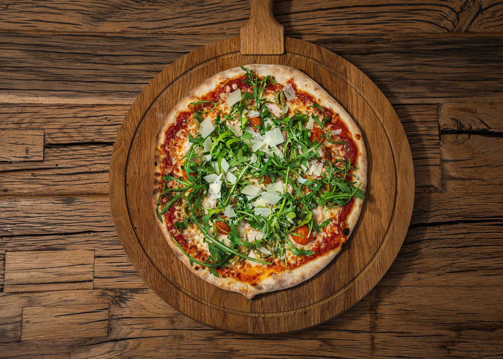 Tomatensaus, mozzarella, kip, pesto, kerstomaatjes, rucola en parmesan