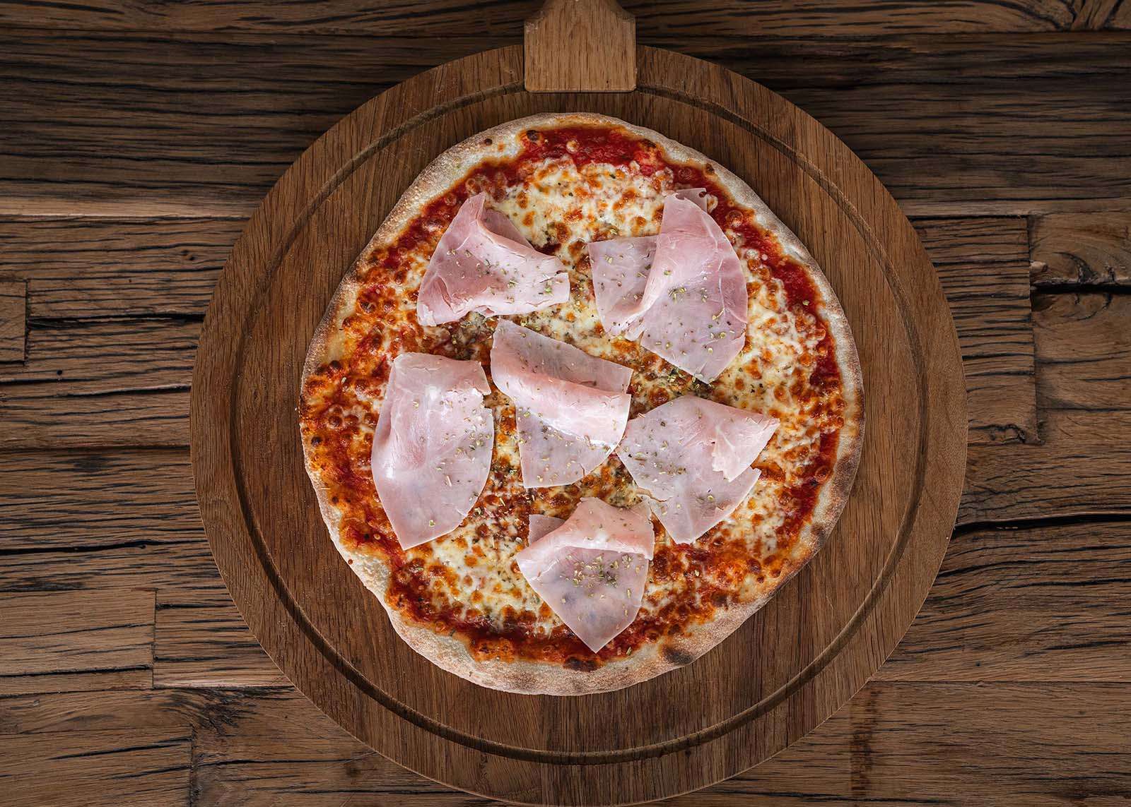 tomatensaus, mozzarella, hesp, champignons,zwarte olijven, oregano