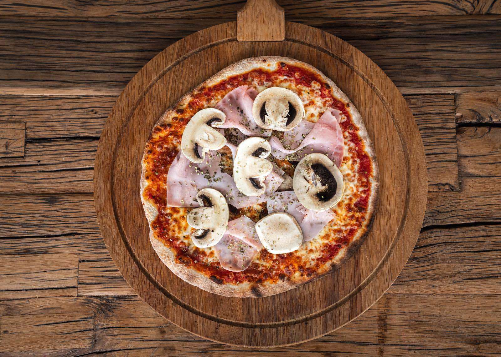 Mozzarella, tomatensaus, hesp, champignons