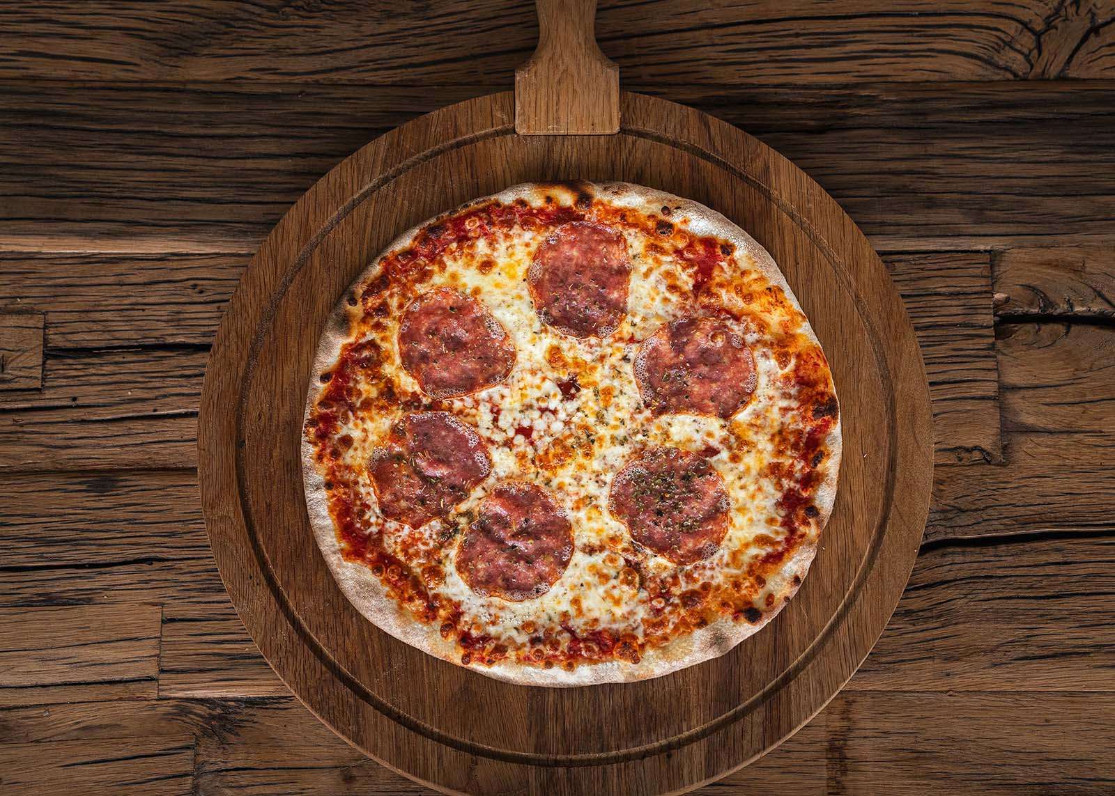 tomatensaus, mozzarella, pikante salami, jalapeno, oregano